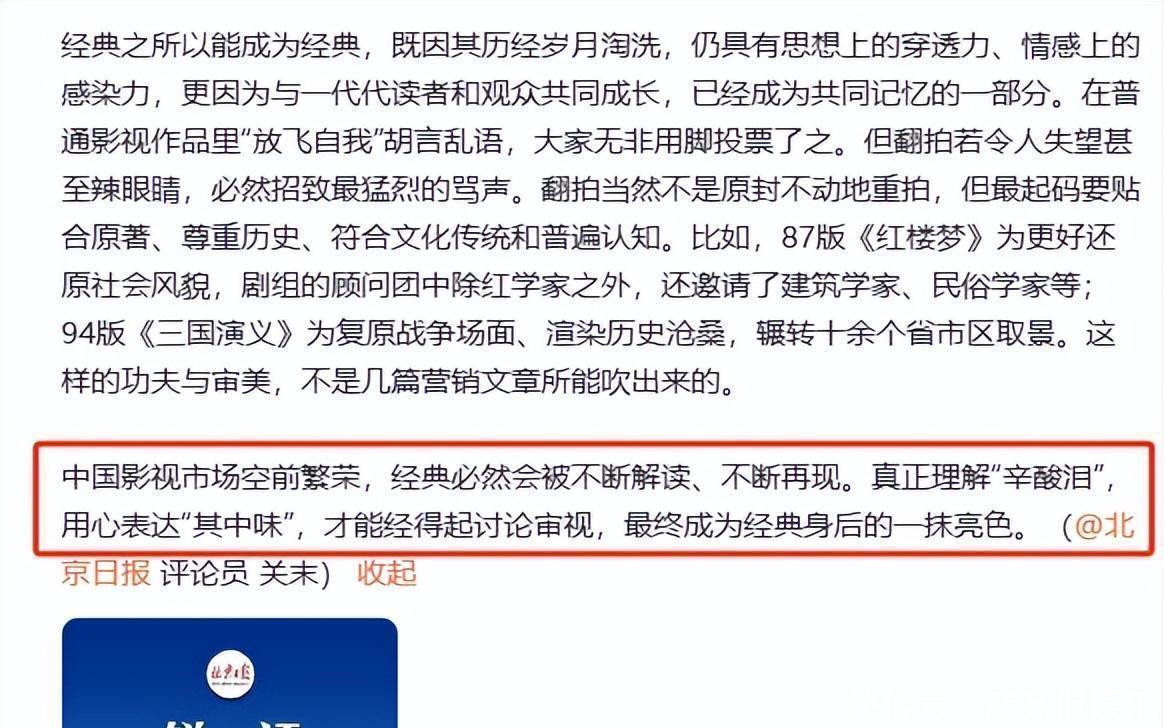 不过最终的口碑都不是很好,远远不如87版那样深入人心。其实,很多翻拍作品就只想着迎合当下那种快餐式审美,胡乱加入一些新鲜元素,核心剧情也经常随意改动。这种翻拍完全失去了《红楼梦》应有的古典韵味,跟87版剧组那种认真打磨、坚守原著精髓的态度简直天壤之别。
