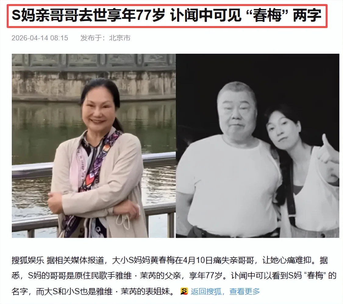 4月14日,搜狐娱乐报道黄春梅的亲哥哥离世。